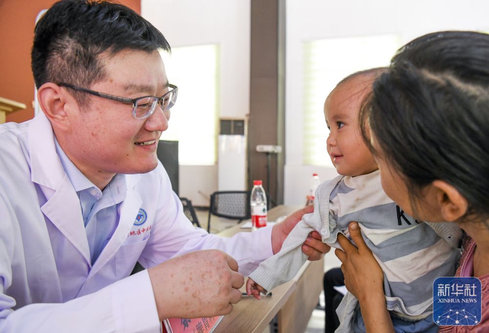 ↑ 在新疆伊犁哈萨克自治州中医医院,江苏援疆医生张仕兵(左)为患者检查身体(2025年7月6日摄)。新华社记者 徐宏岩 摄