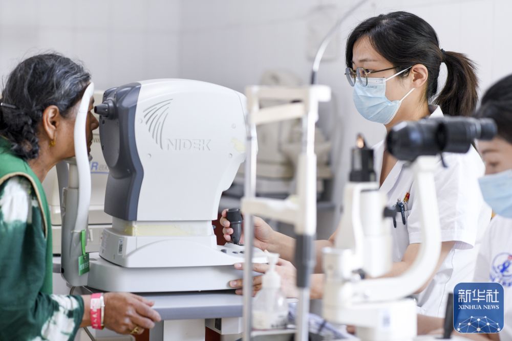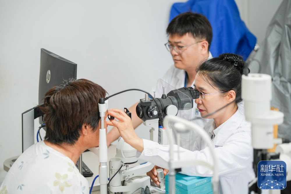 ↑ 在新疆伊犁哈萨克自治州中医医院,江苏援疆医生林琳(右)与本院眼科主任王庆一同为患者进行眼部检查(2025年7月6日摄)。新华社记者 徐宏岩 摄