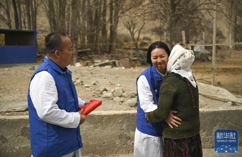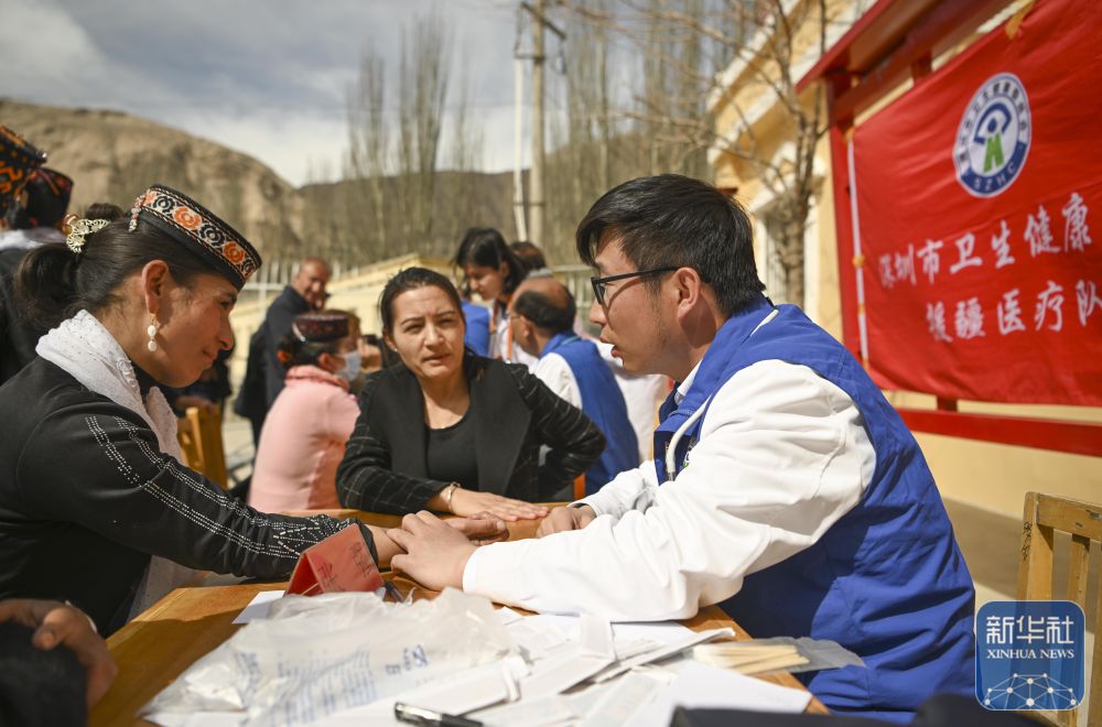 ↑ 在新疆塔什库尔干塔吉克自治县库科西鲁格乡卫生院,深圳援疆重症医学科医生杨正月(右)和乡卫生院医生一起为村民检查身体(2025年3月24日摄)。新华社记者 胡虎虎 摄
