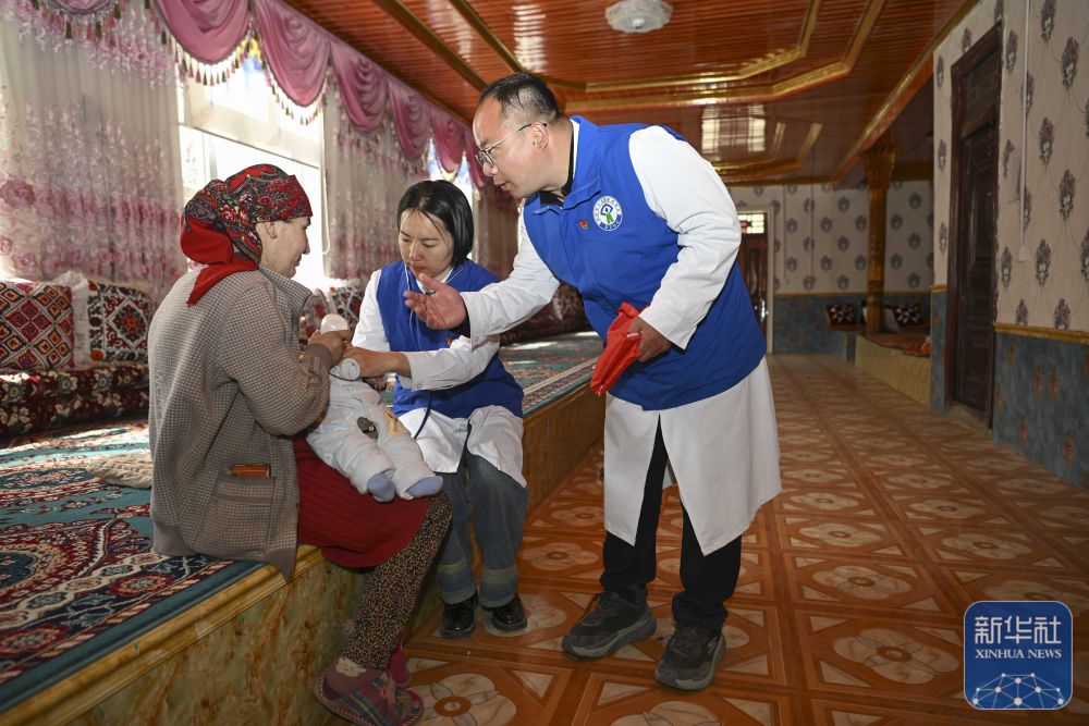 ↑ 在新疆塔什库尔干塔吉克自治县库科西鲁格乡瓦窑本村,深圳援疆新生儿科医生潘千(中)与同事许林森(右)在村民家为新生儿检查身体,并叮嘱养护注意事项(2025年3月24日摄)。新华社记者 胡虎虎 摄
