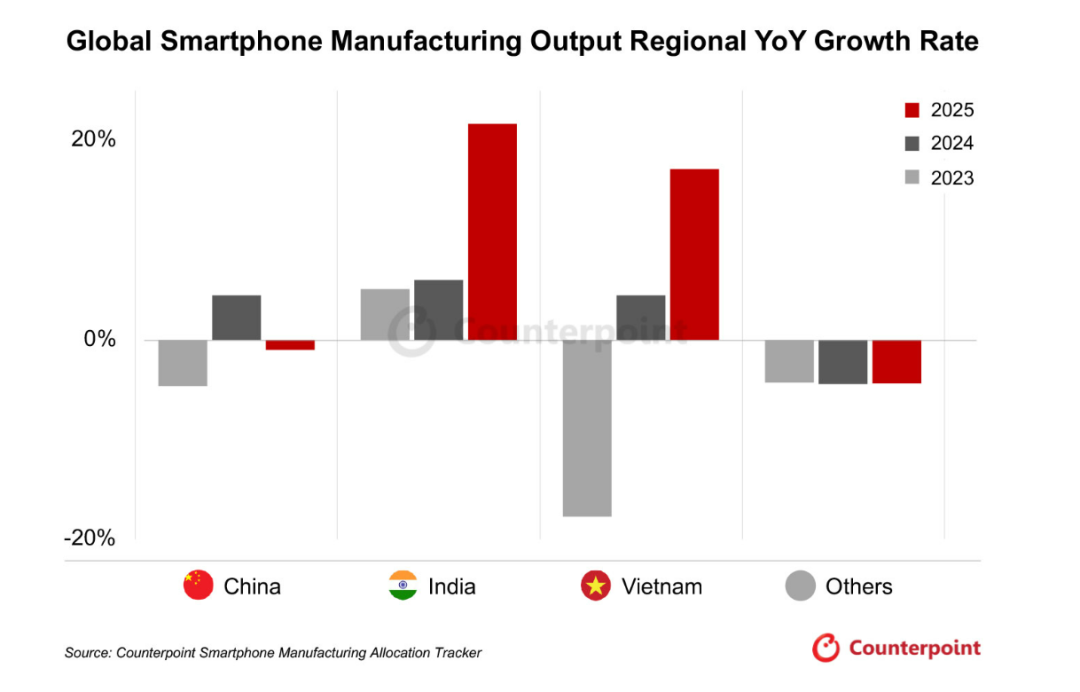 印度预计成为最大受益者,2025年制造产量预计实现两位数百分比增长,达到全球总产量的20%,创下新高。这主要得益于Apple和Samsung持续的生产和出口需求。与此同时,越南作为全球制造与出口枢纽,在Samsung和Motorola增加生产的情况下,产量预计也能实现稳健增长。