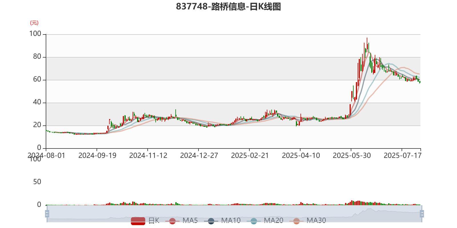 中证智能财讯路桥信息(837748)8月1日晚间披露业绩预告,预计2025年上半年营业收入同比下降50%;归母净利润亏损2400万元至2500万元,上年同期亏损532.18万元。以8月1日收盘价计算,路桥信息目前市盈率(TTM)约为1069.5倍-1410.79倍,市净率(LF)约14.41倍,市销率(TTM)约18.29倍。