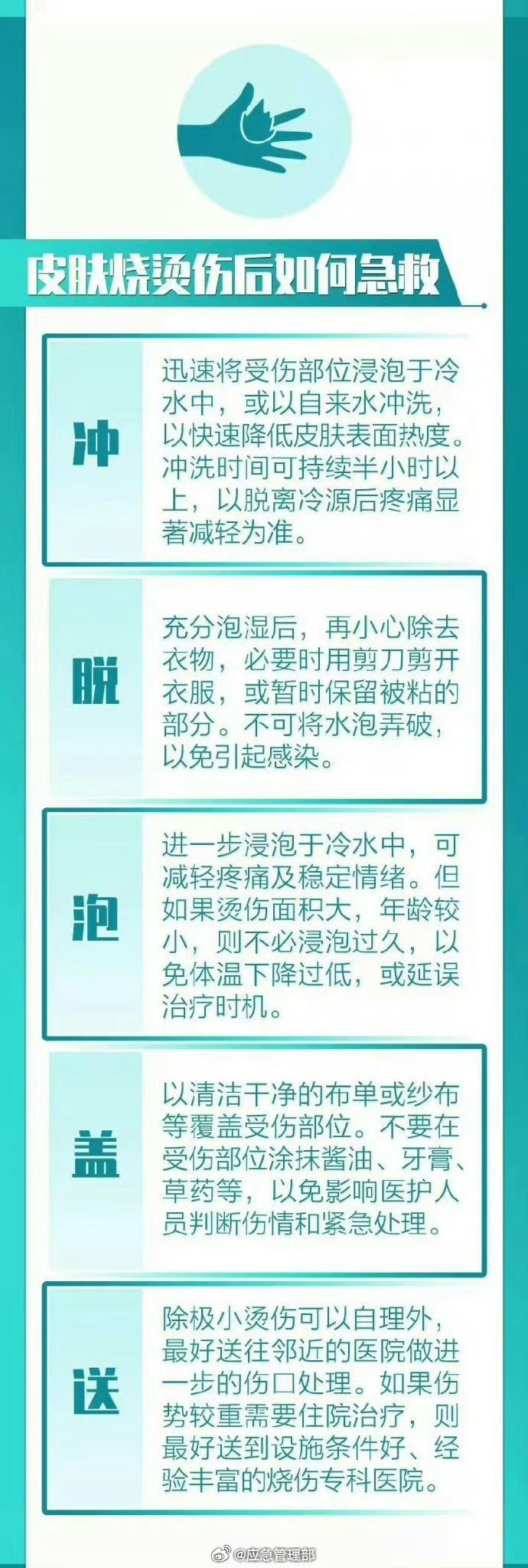 当发生I、II度烧烫伤时,切勿慌张,可按照急救五字诀“冲-脱-泡-盖-送”处理,可在一定程度上缓解烧烫伤对人体的危害。一般而言,烧烫伤后的2小时内是黄金急救时间↓↓↓