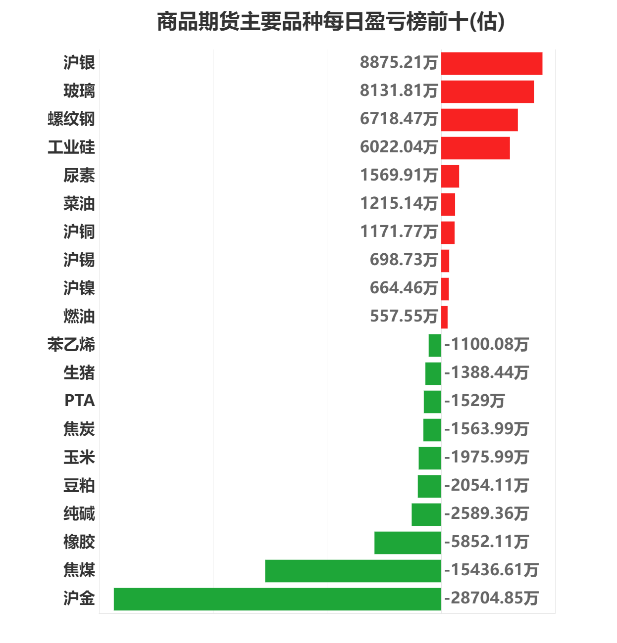 品种盈亏榜:今日商品期货上榜机构席位中沪银盈利第一,为8875.21万元。